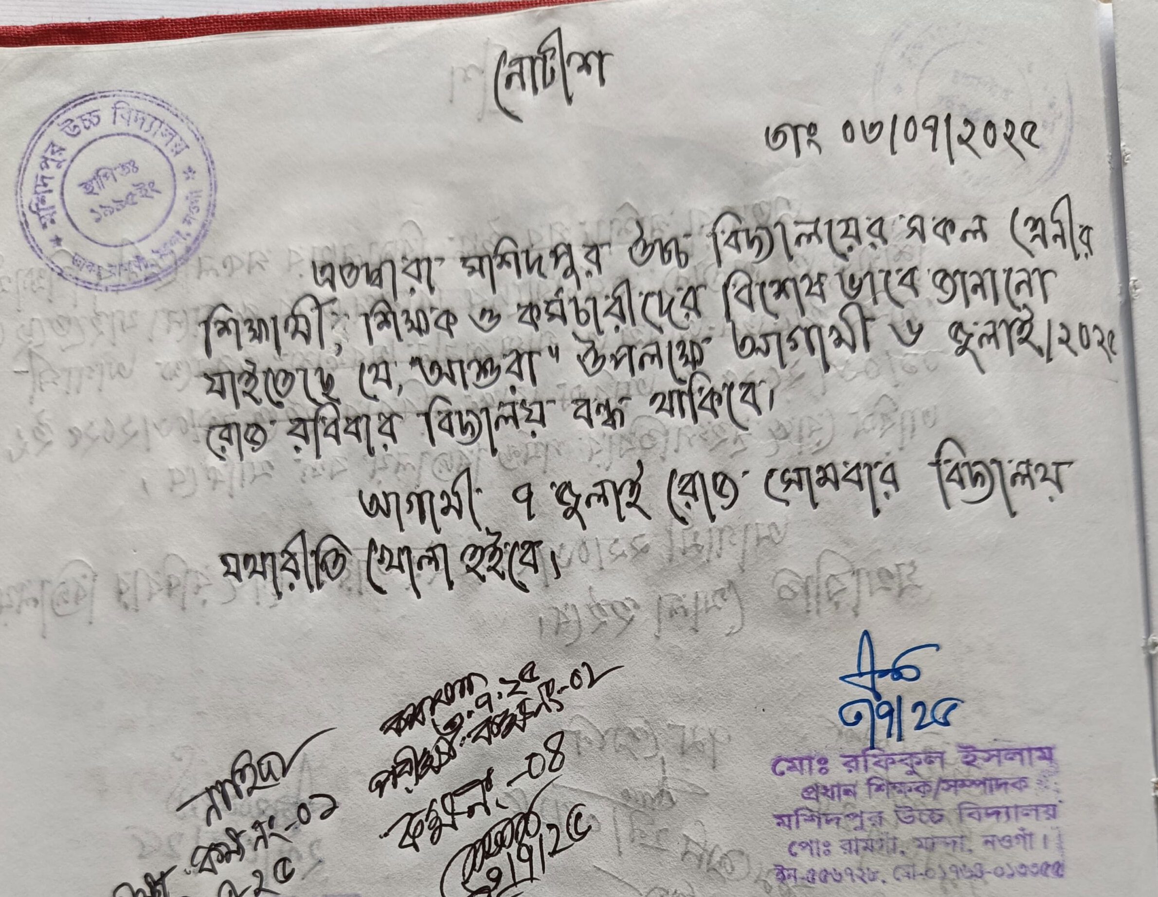 এতদ্বারা মশিদপুর উচ্চ বিদ্যালয়ের সকল শ্রেণীর শিক্ষার্থী, শিক্ষক ও কর্মচারীদের বিশেষ ভাবে জানানো যাইতেছে যে, “আশুরা” উপলক্ষে আগামী ৬ জুলাই/২০২৫ রোজ রবিবার বিদ্যালয় বন্ধ থাকিবে |