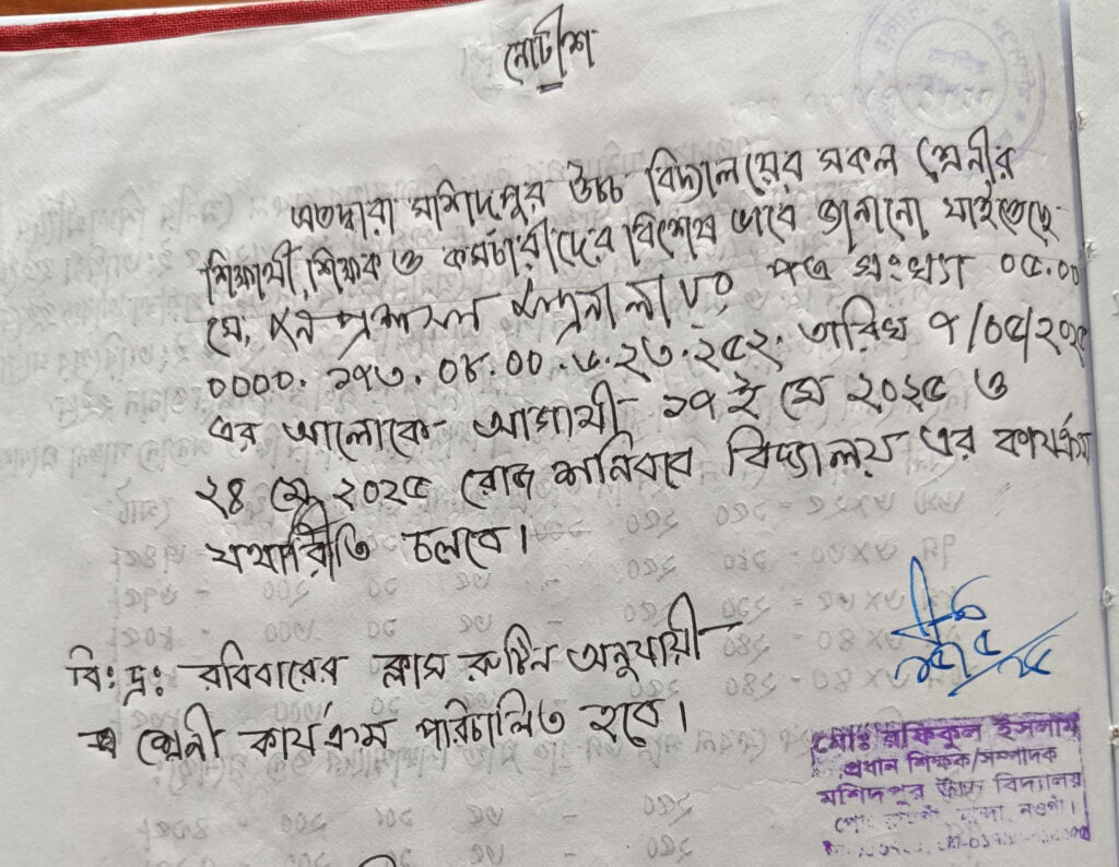 এতদ্বারা মশিদপুর উচ্চ বিদ্যালয়ের সকল শ্রেণীর শিক্ষার্থী, শিক্ষক ও কর্মচারীদের বিশেষ ভাবে জানানো যাইতেছে যে, জনপ্রশাসন মন্ত্রণালয়ের পত্র সংখ্যা ০৫.০০০০০০.১৭৩.০৮.০০.৬.২৩.২৫২ তারিখ ৭/০৫/২০২৫ এর আলোকে আগামী ১৭ই মে ২০২৫ ও ২৪ মে ২০২৫ রোজ শনিবার বিদ্যালয় এর কার্যক্রম যথারীতি চলবে |